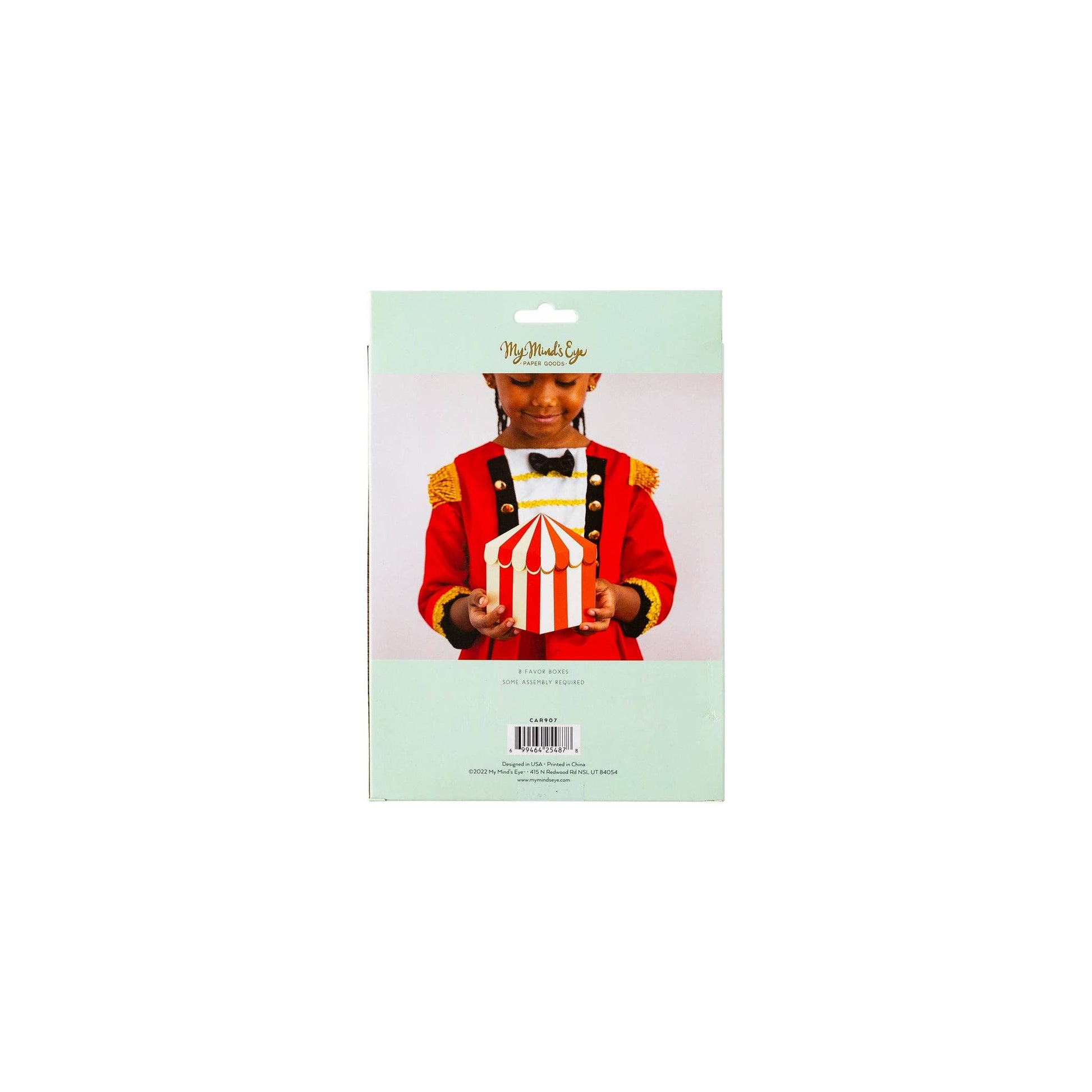 Make sure that everyone is a winner with these big top inspired favor boxes. Designed to look like a carnival tent these favor boxes are the perfect parting gift for your party guests. Just like a big top tent, these treat boxes are super roomy making it easy to pile carnival candy, temporary tattoos and sticker sheets, and mini prizes high! • includes 8 paper treat boxes • some basic assembly required • assembled product measures 6" x 4" x 4" • gold foil accents
