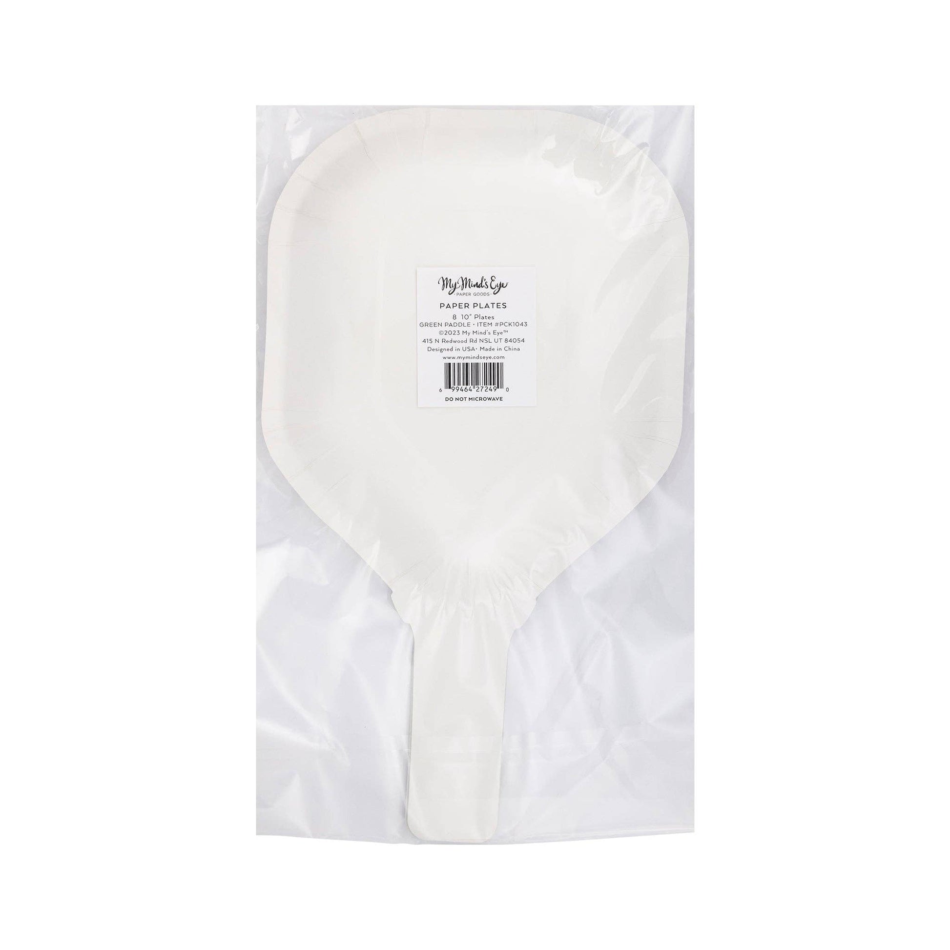 Be the talk of your next party with our White Paddle Plate! This uniquely shaped plate is perfect for serving up all your party treats and adding a touch of fun to the table. Serve up some aces with this unique plate that is sure to be a hit with pickleball enthusiasts and party-goers alike. • includes 8 paper plates • 6" x 10" • gold foil